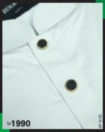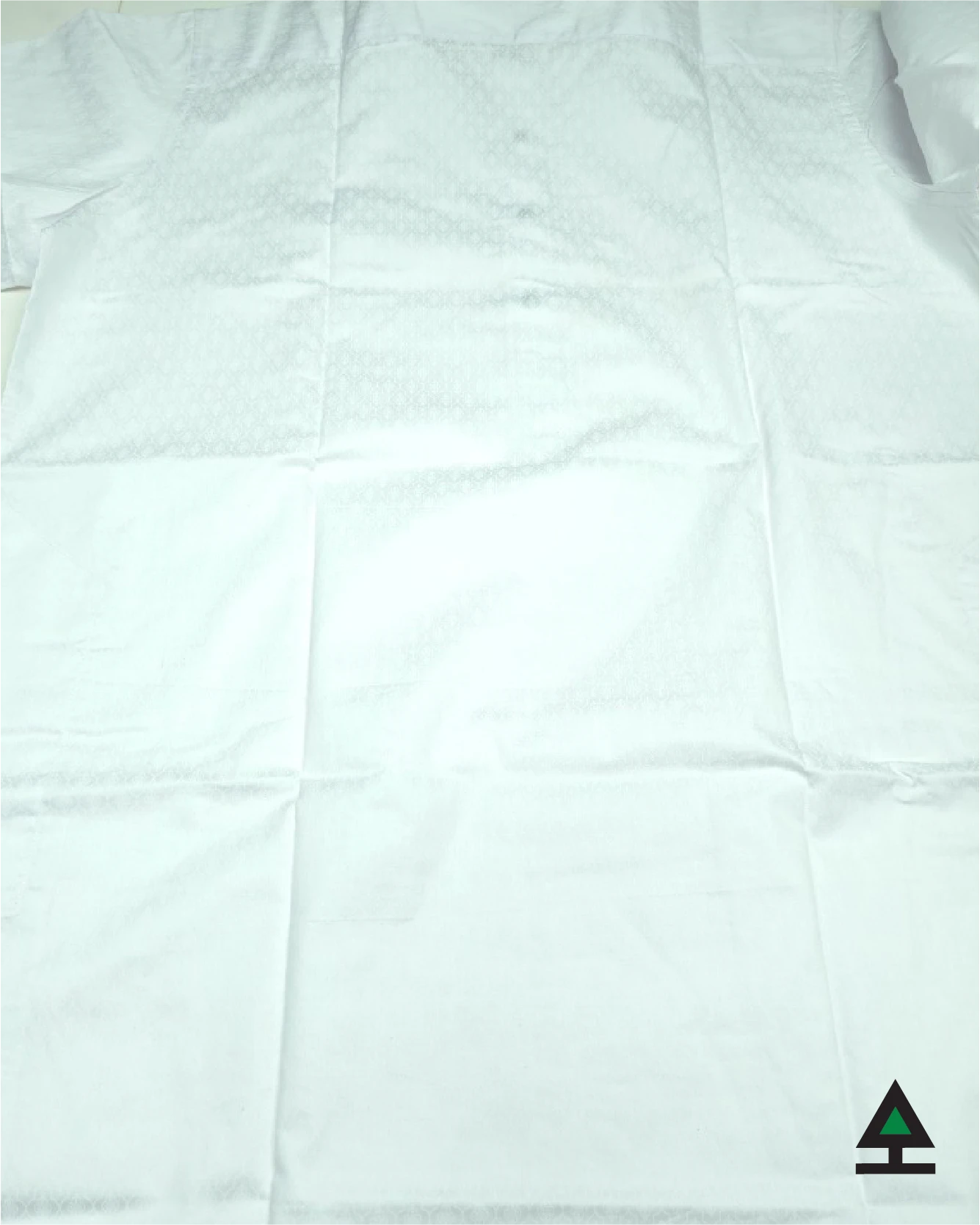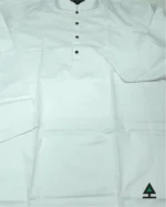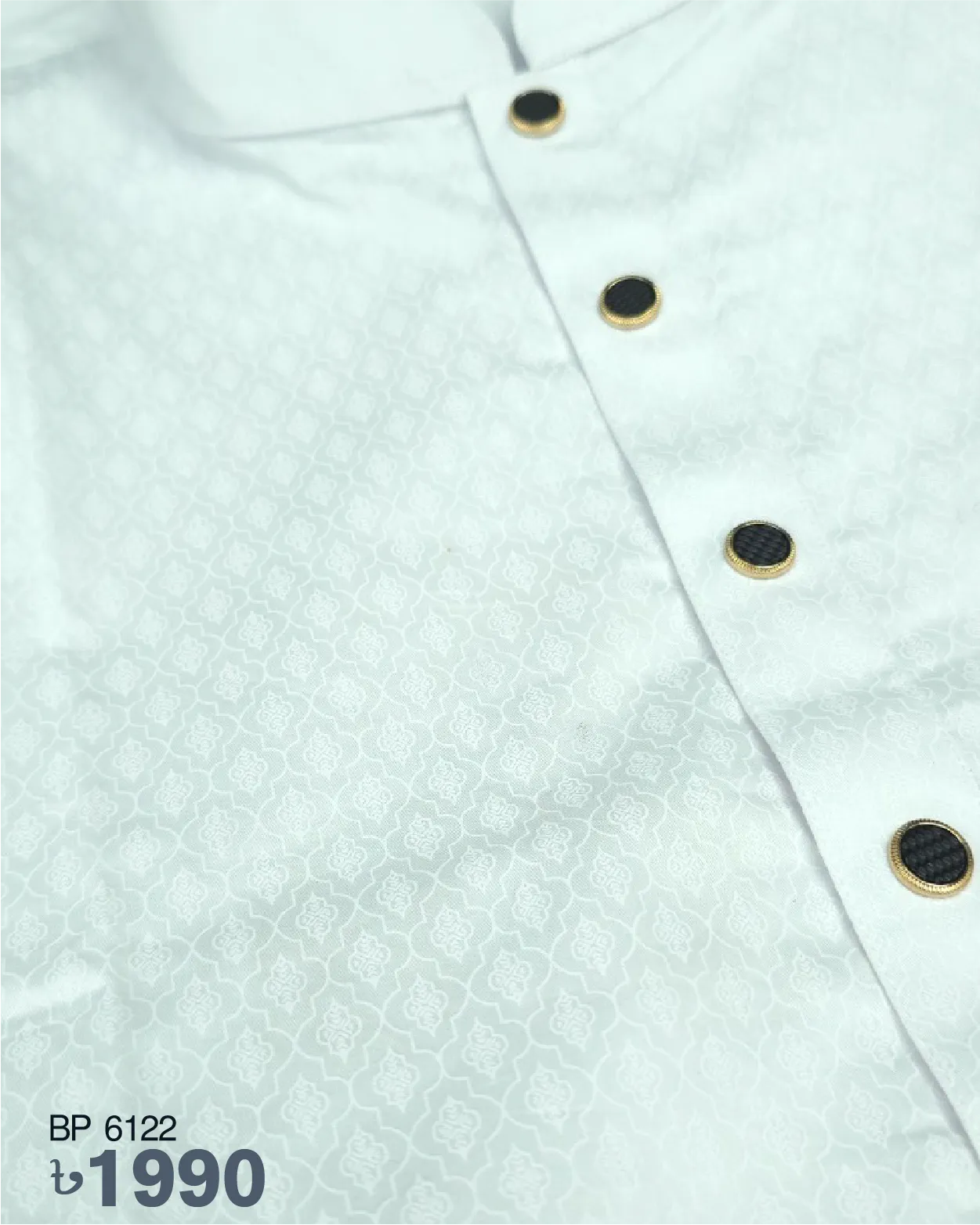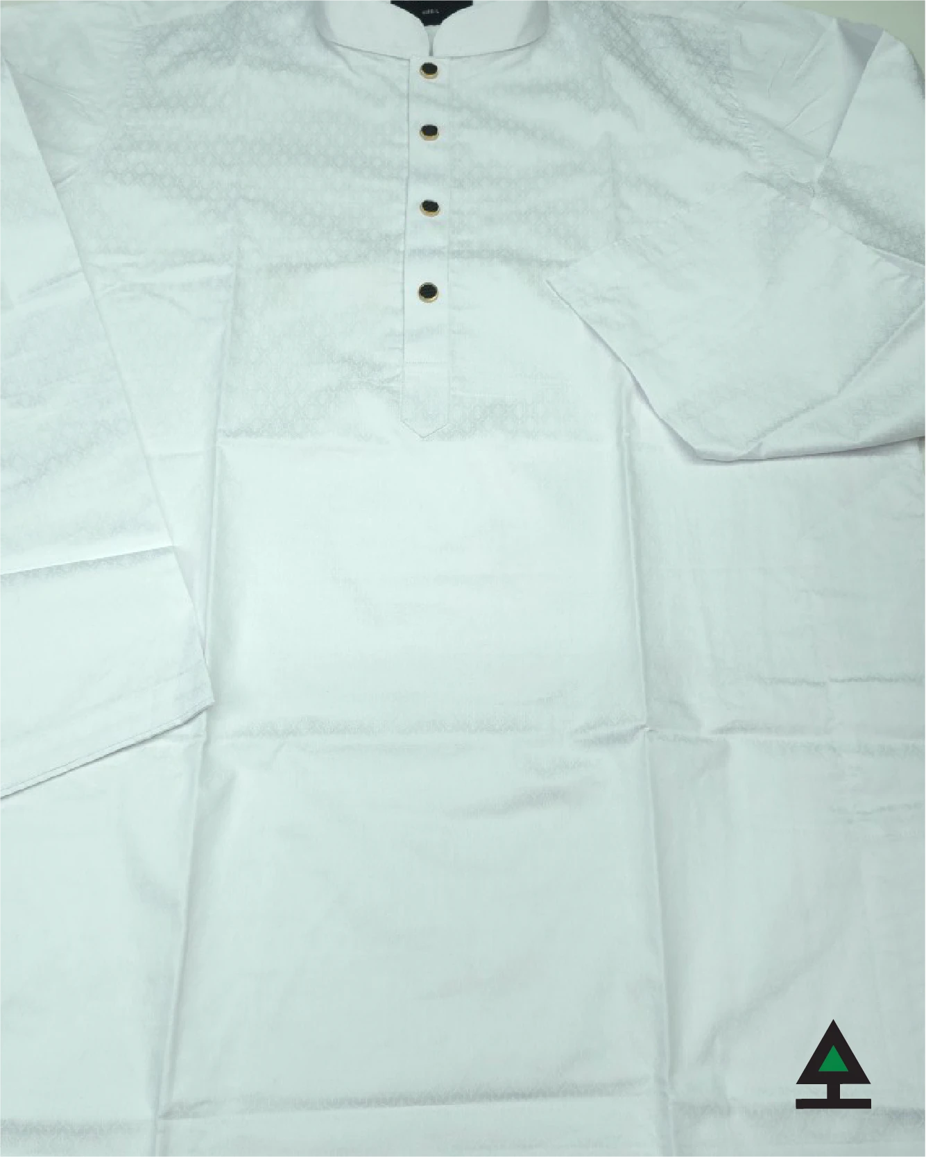 White panjabi with on color patterns on whole body. Metal button on the plate adds an ethnic look to it.