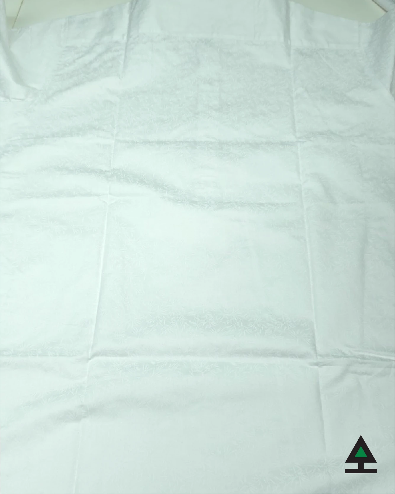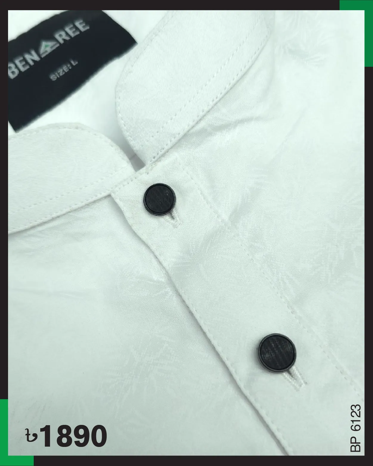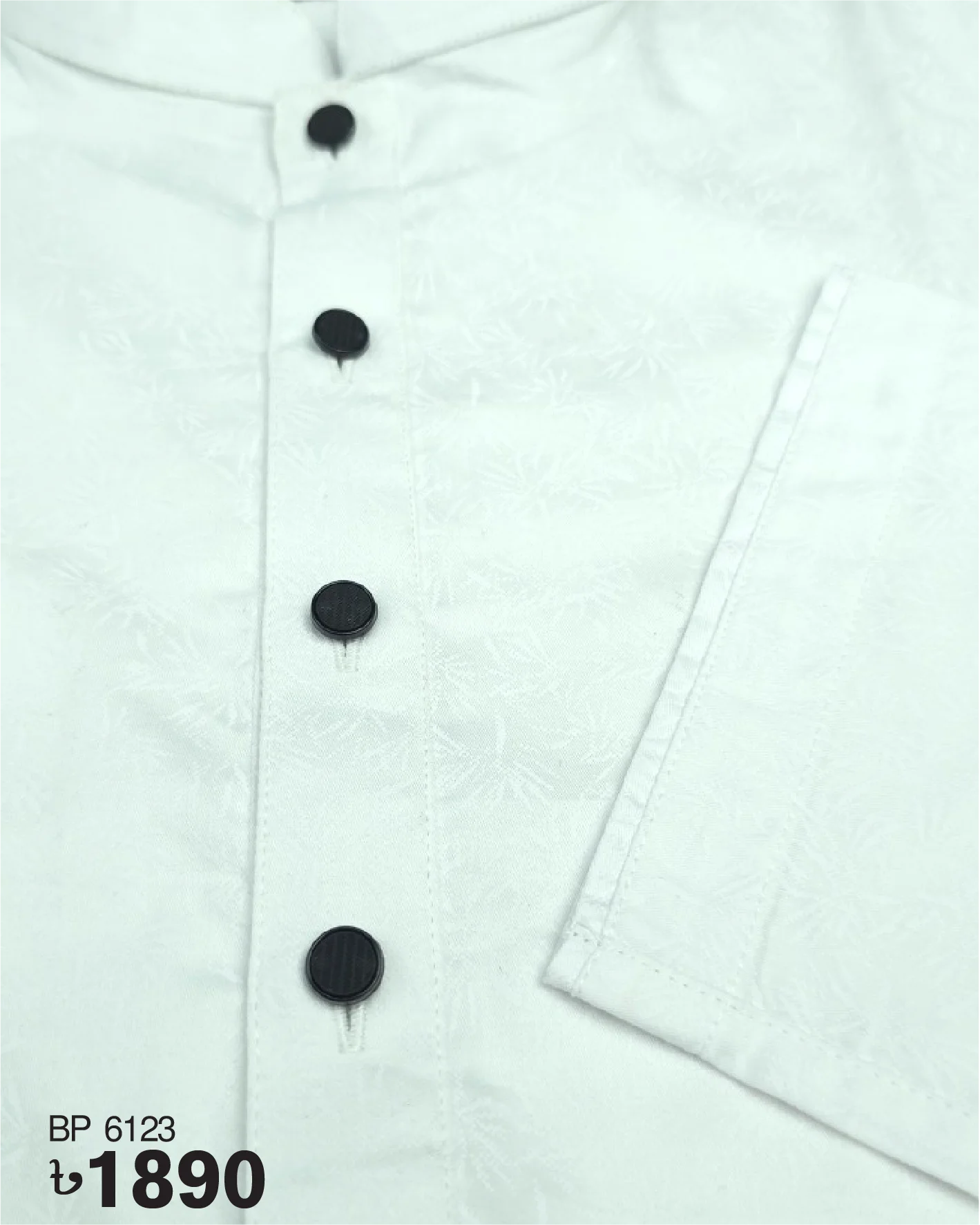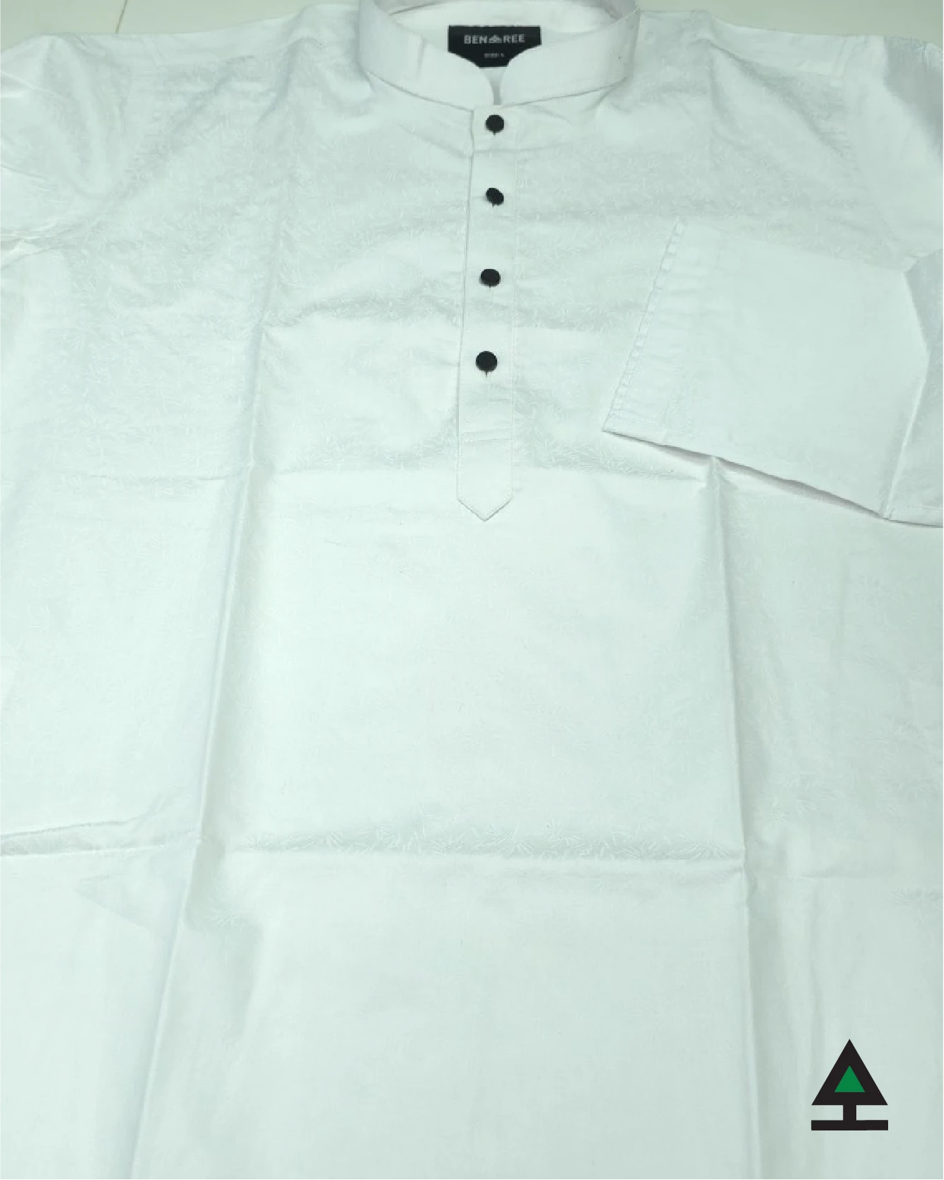 White panjabi with on color patterns on whole body. Metal button on the plate adds an ethnic look to it.