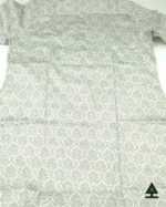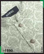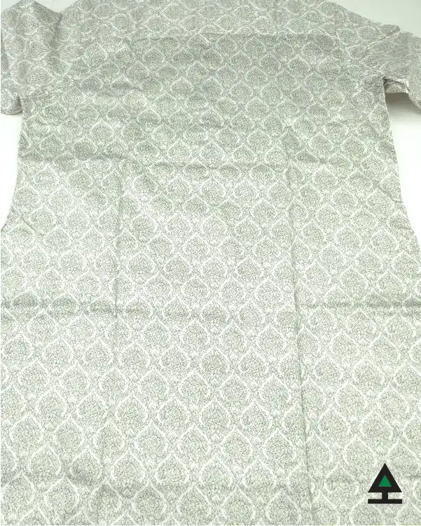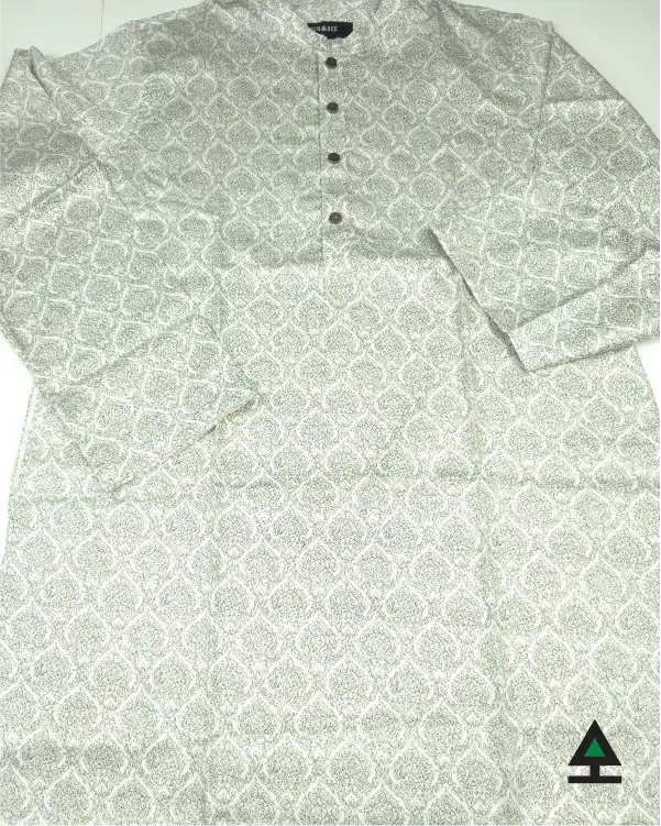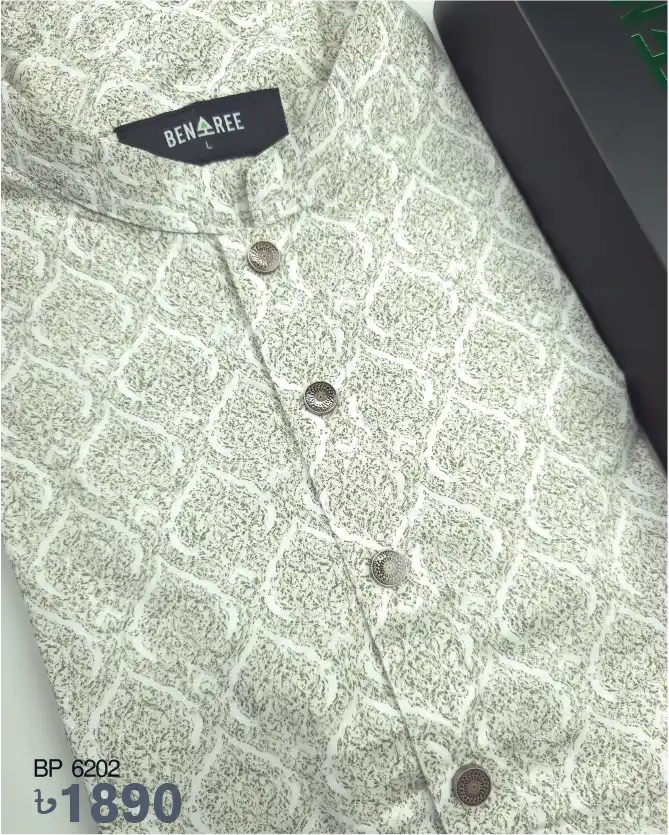 All body ethnic print on light cream color panjabi. Metal push button to complement the pattern work of the body.