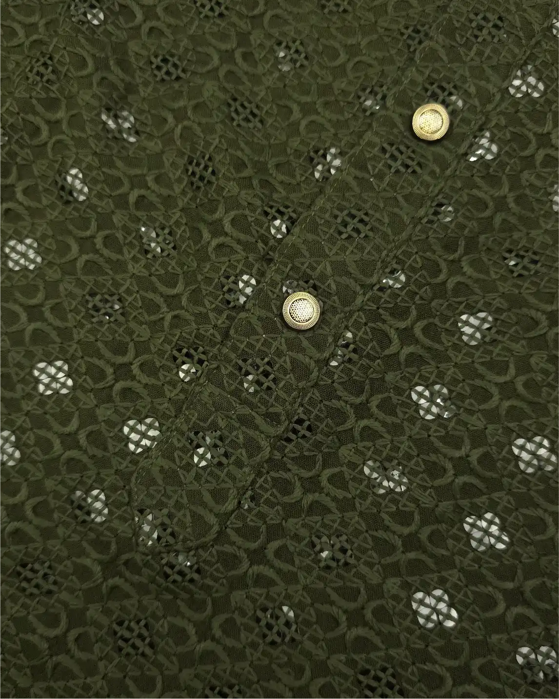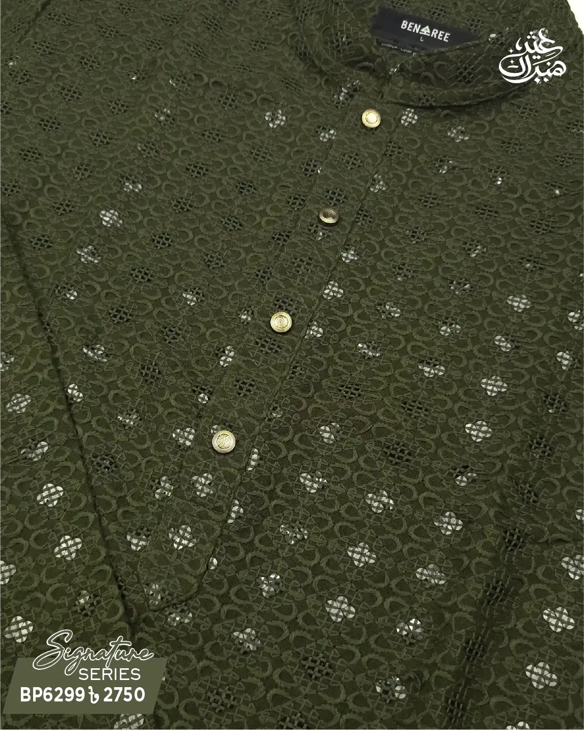 Decorated with fine sequence (sequin) work, this Panjabi brings festive glamour while maintaining a balanced ethnic appeal.