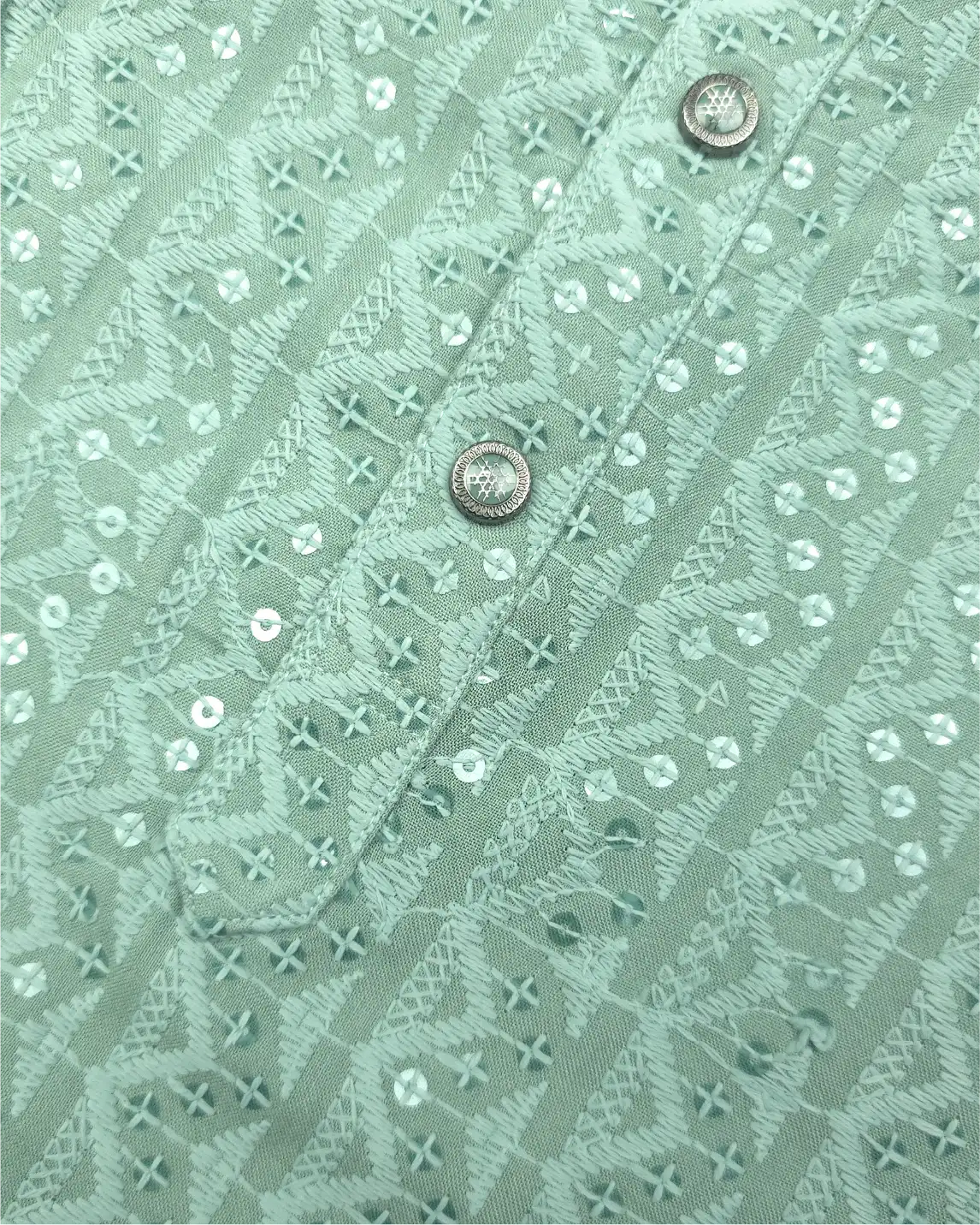 Decorated with fine sequence (sequin) work, this Panjabi brings festive glamour while maintaining a balanced ethnic appeal.