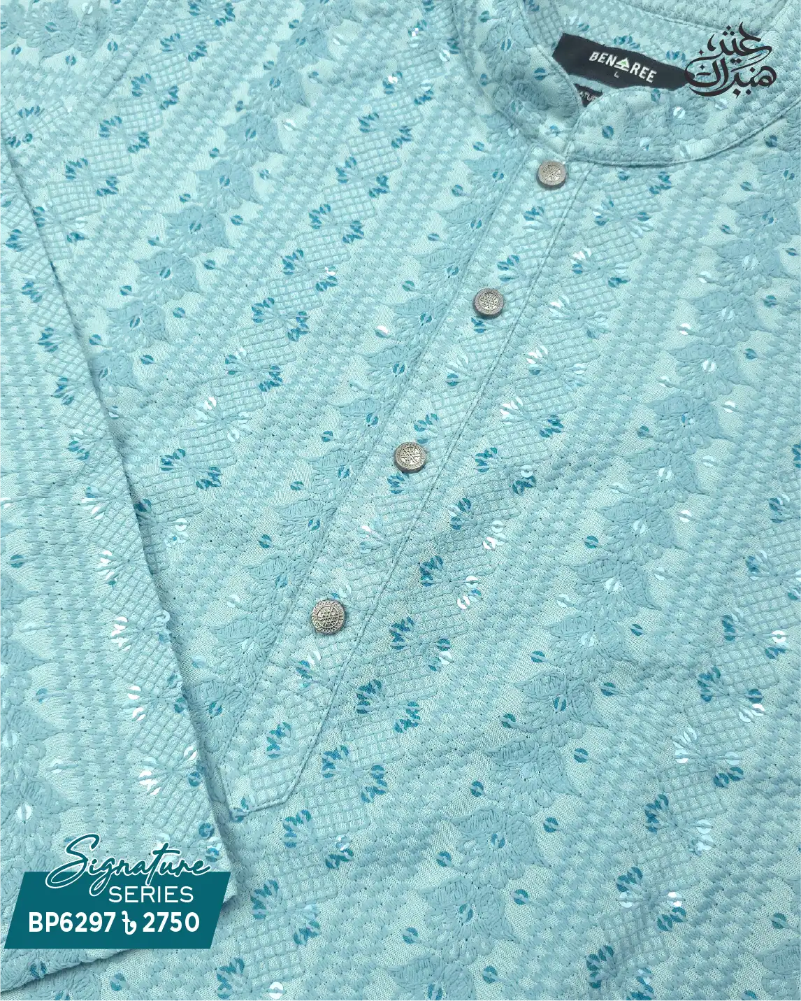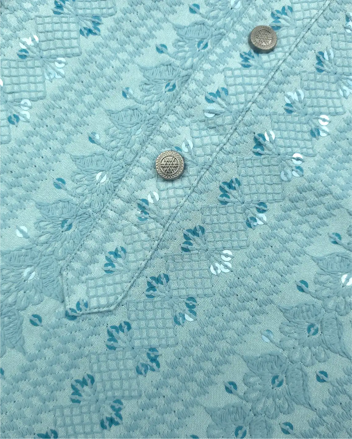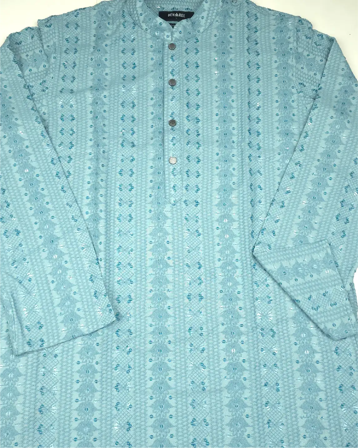 Decorated with fine sequence (sequin) work, this Panjabi brings festive glamour while maintaining a balanced ethnic appeal.