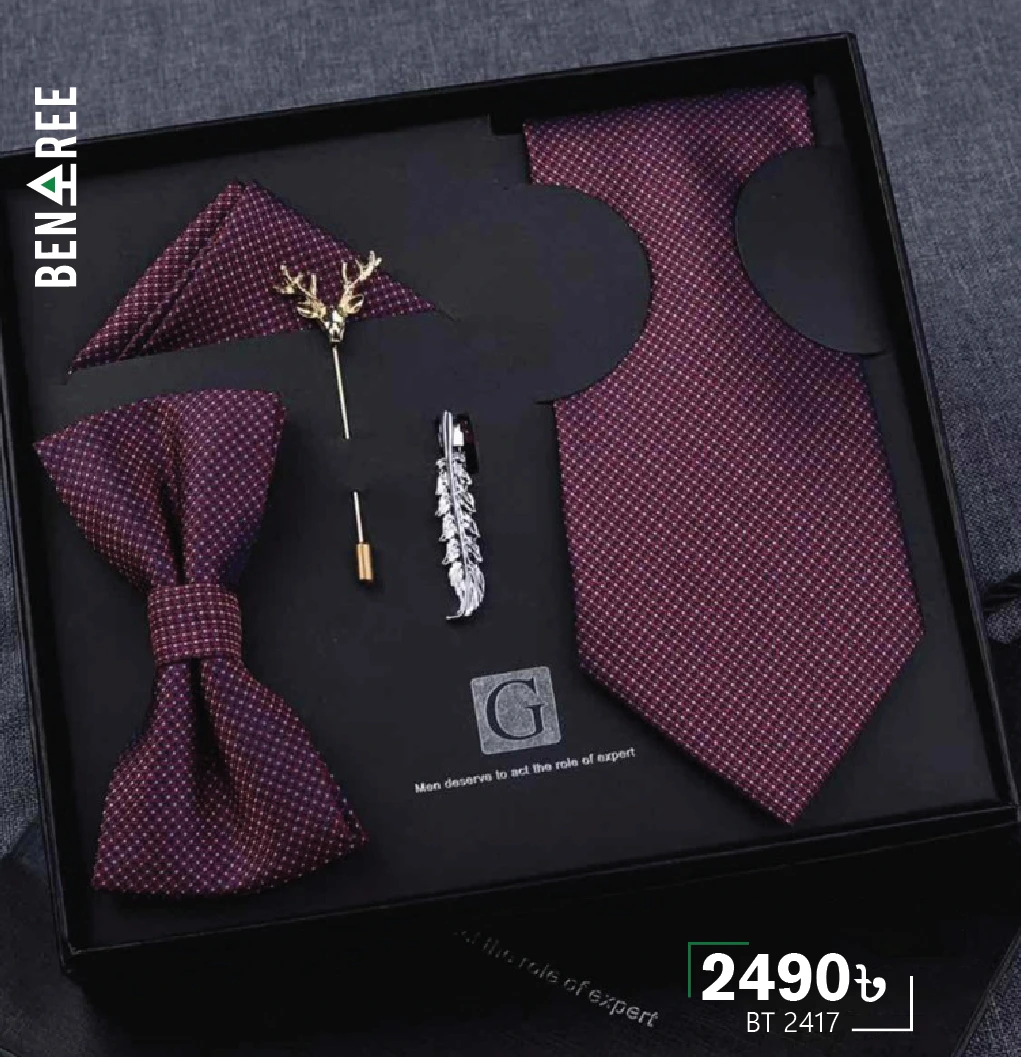 1 pc neck tie, 1 pocket square, 1 tie clip, 1 brooch pin