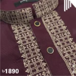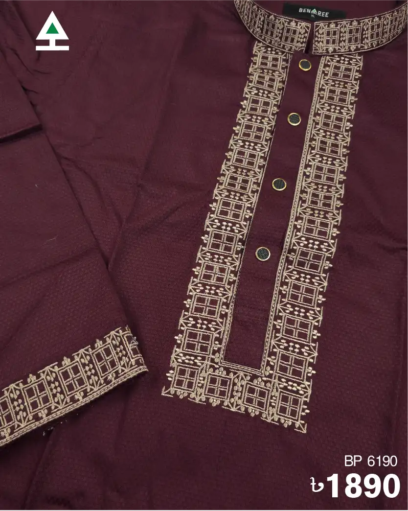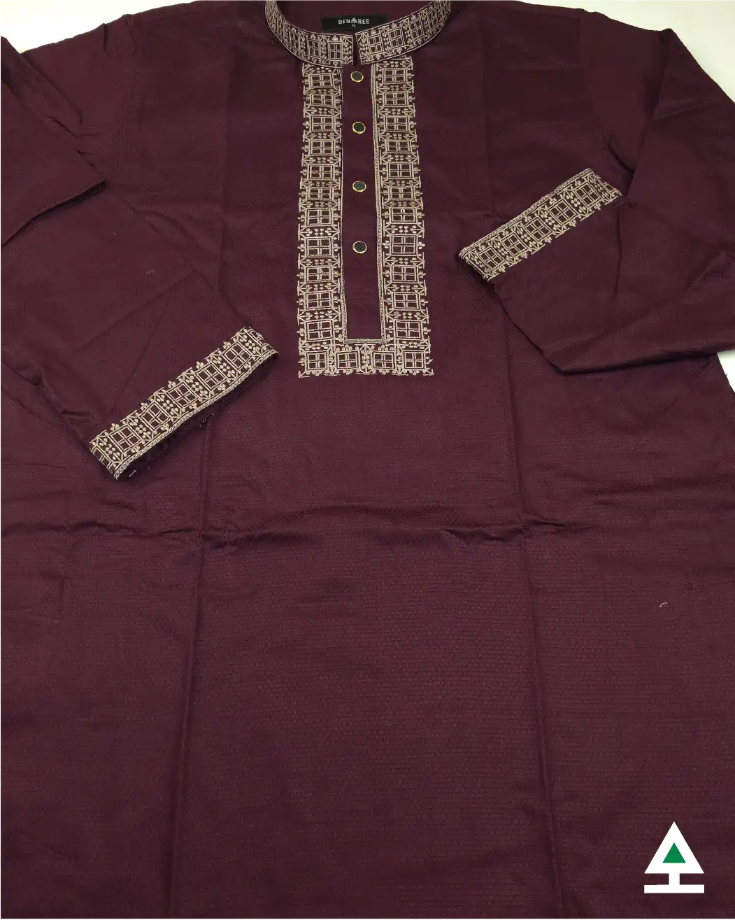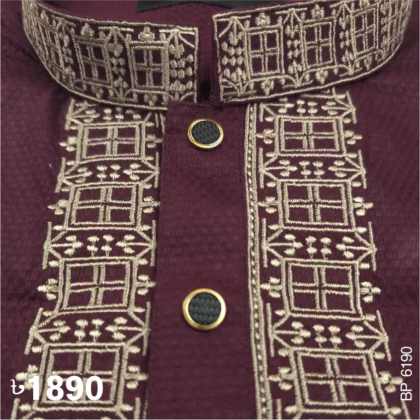 Fine embroidery on neck, cuff & plate of Maroon color Panjabi. Push button to complement the design.