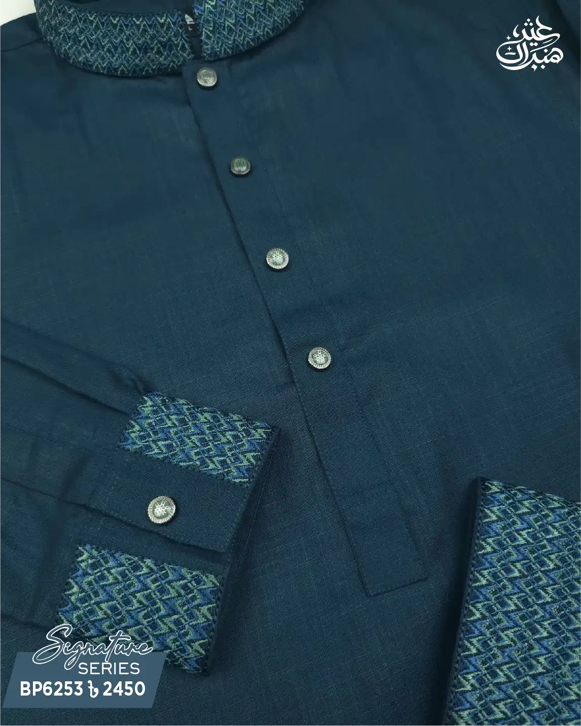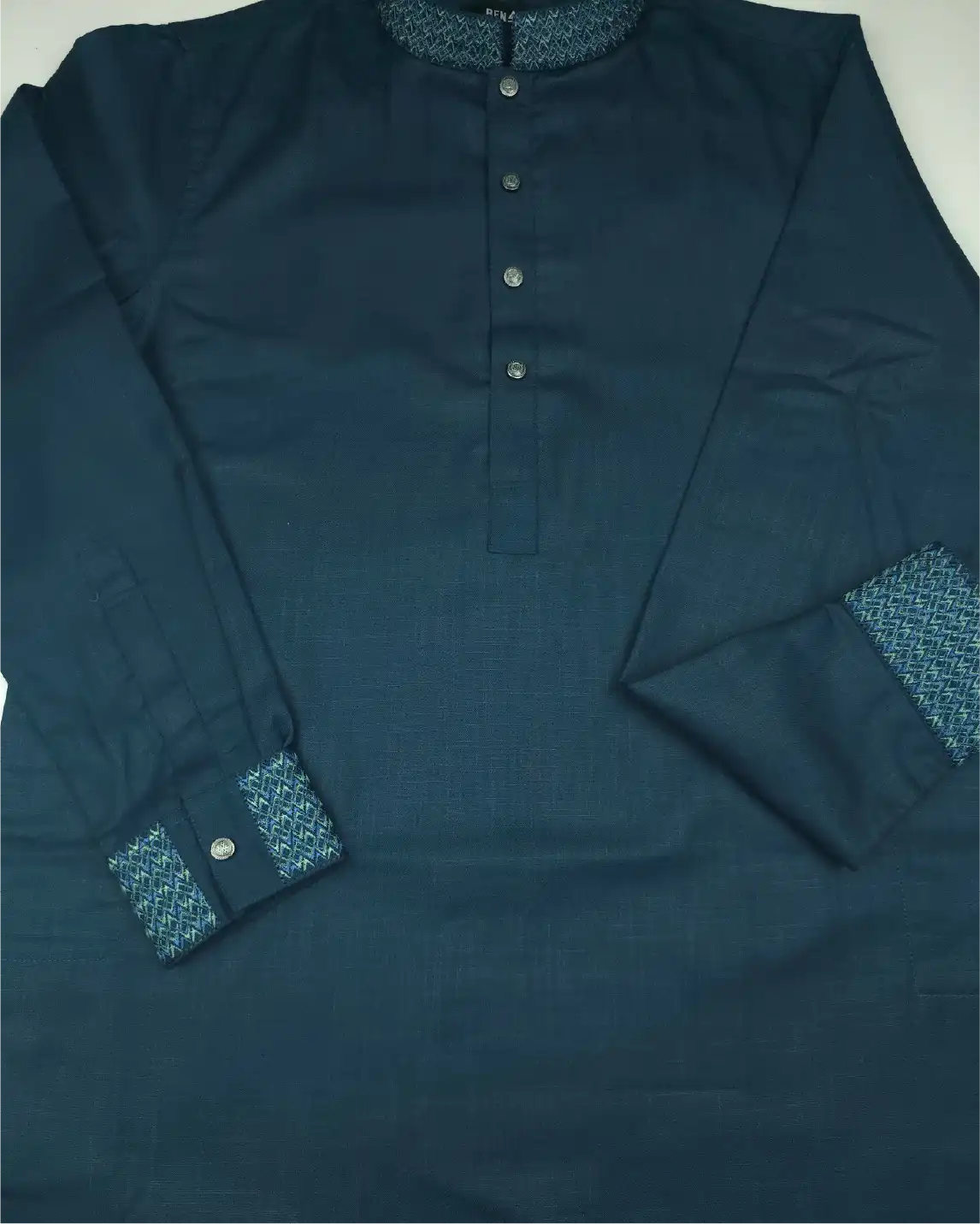 This Panjabi features tasteful embroidery on the neckline and cuff area, adding a touch of clean craftsmanship without overpowering the design.