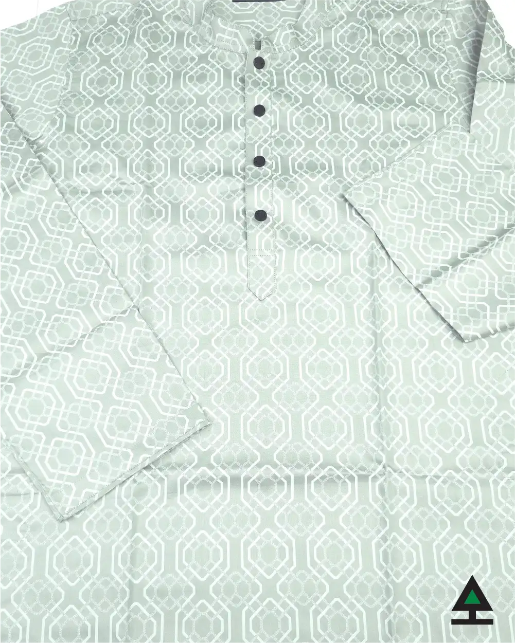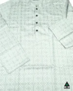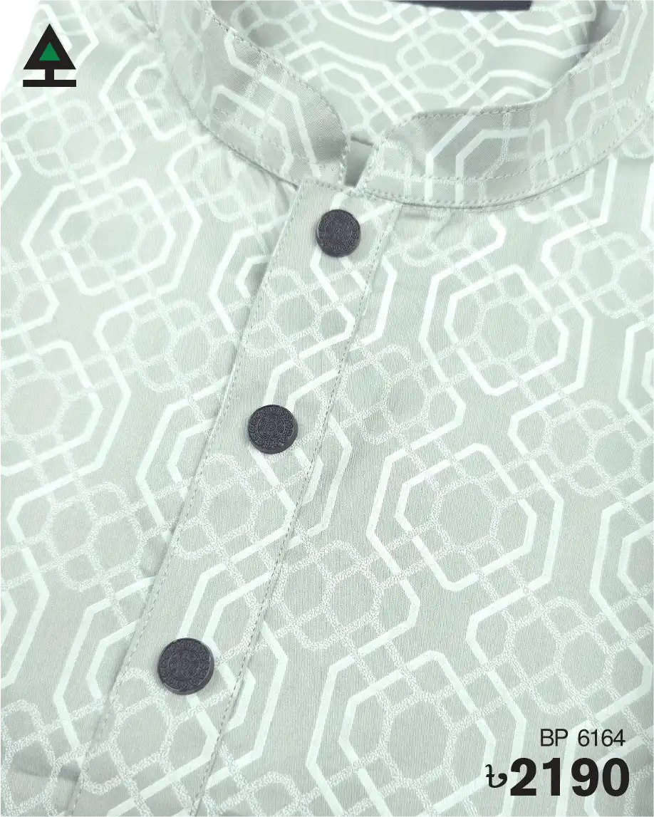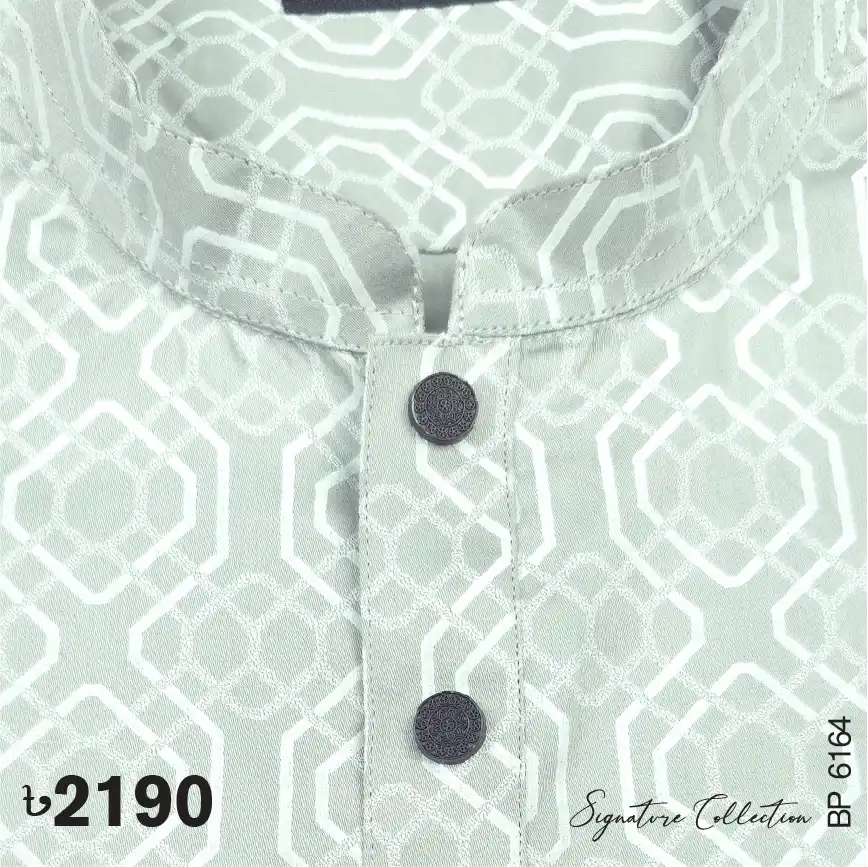Classic printed design on silver color panjabi body. Black push button to complement the design.