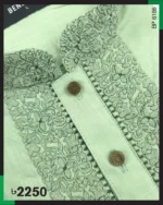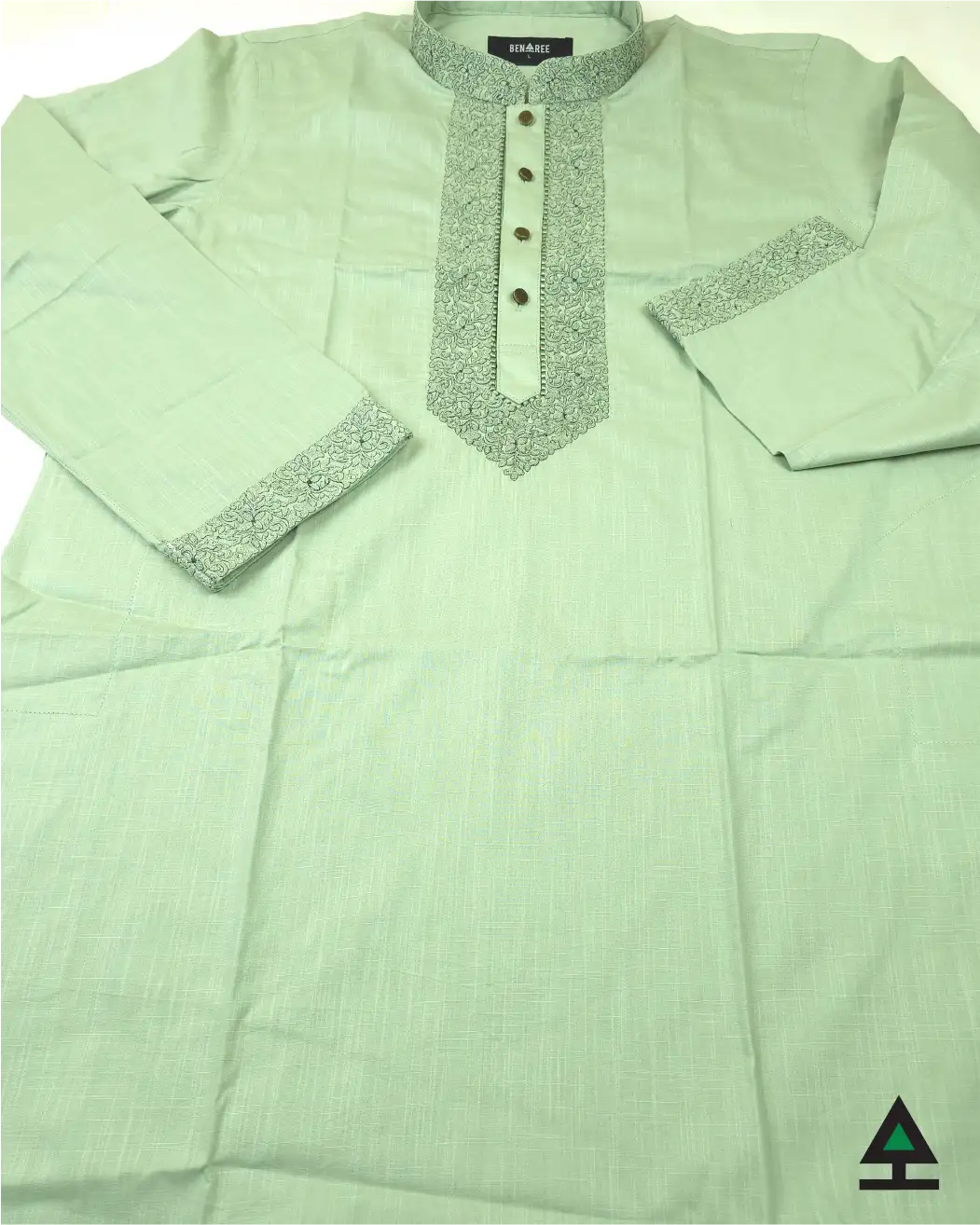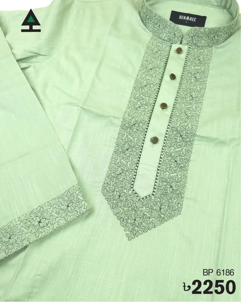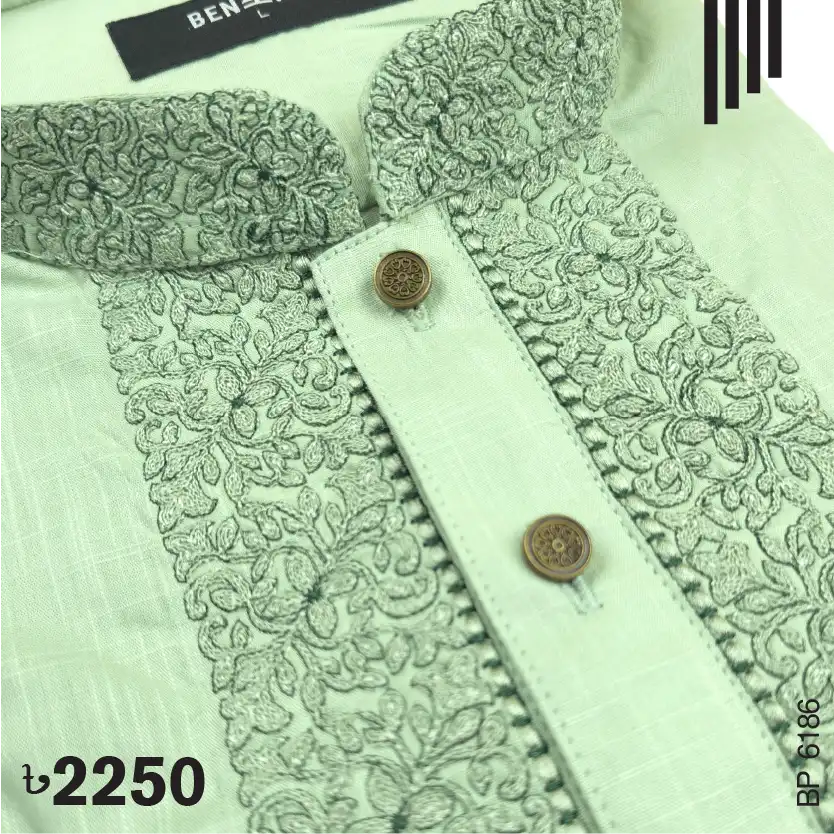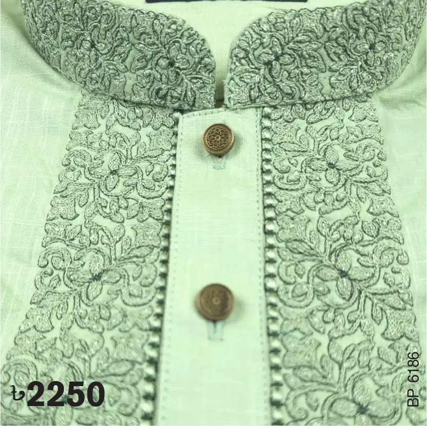 Fine embroidery on neck, cuff & plate of Pistachio color Panjabi. Show button to complement the design.