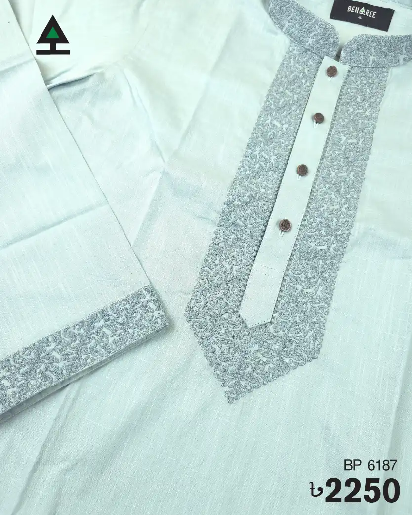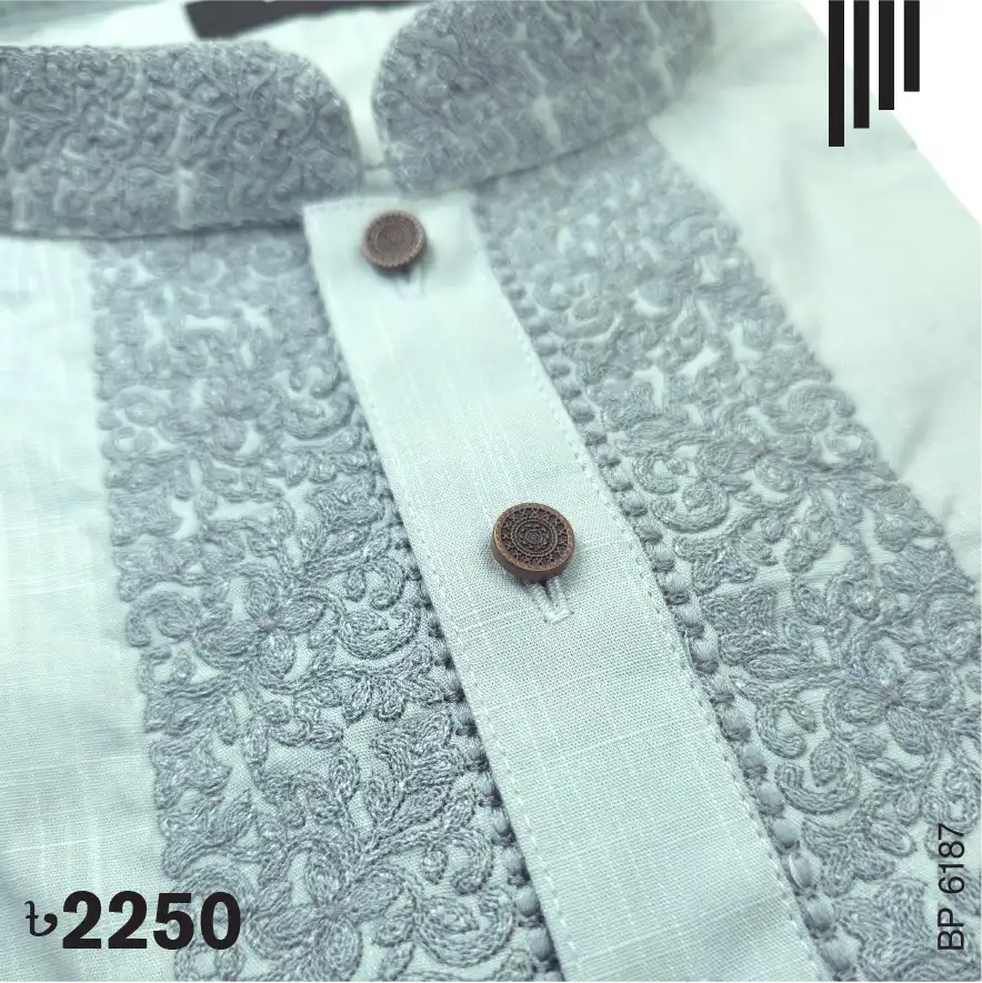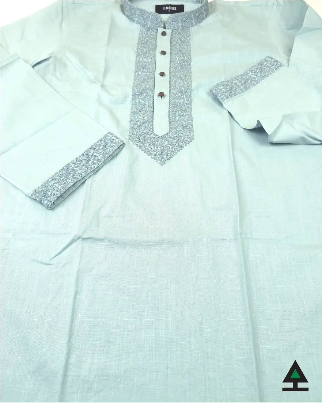 Fine embroidery on neck, cuff & plate of Powder Blue color Panjabi. Show button to complement the design.