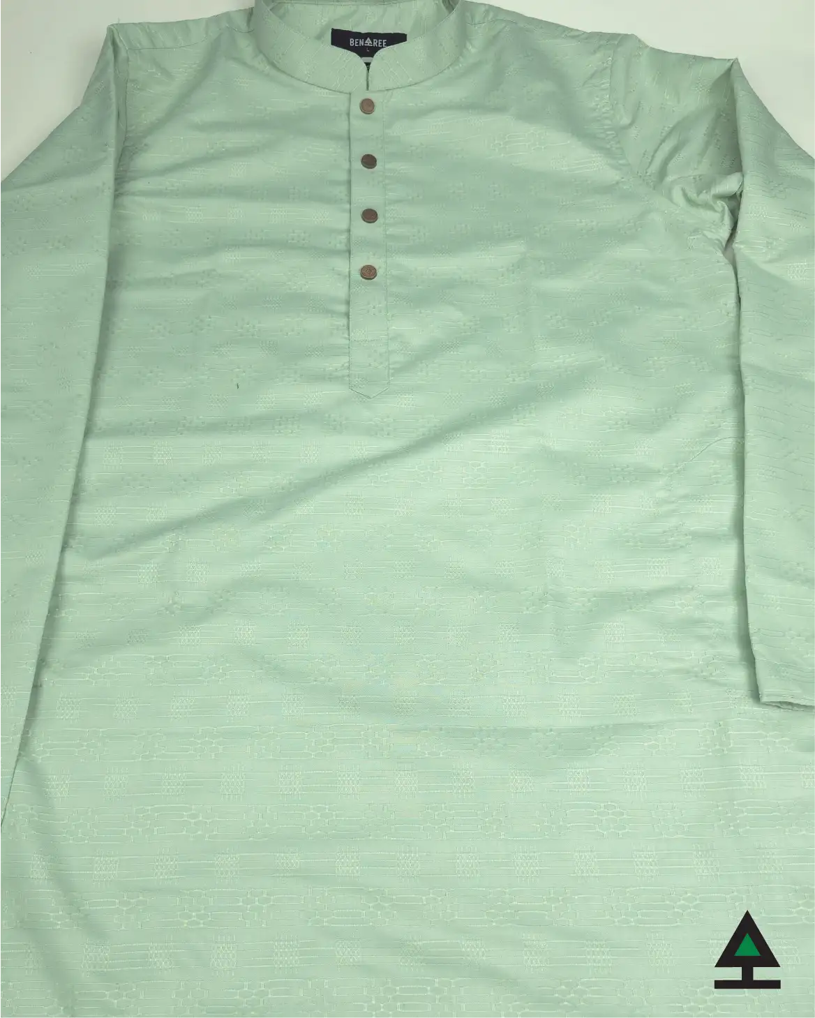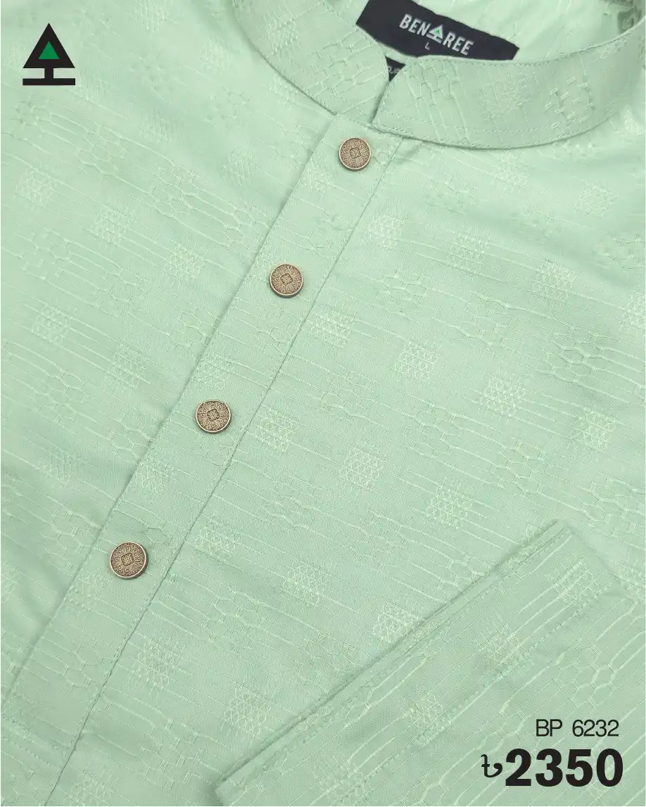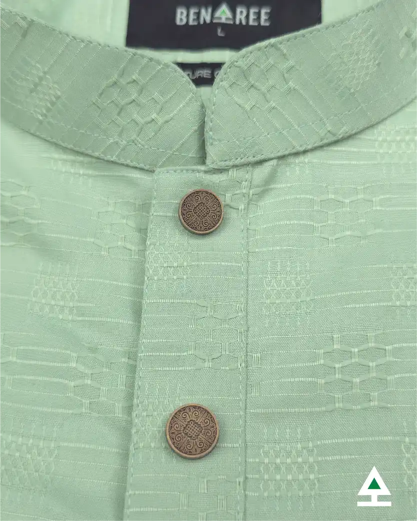 Sophisticated on color design on light green color panjabi. Metal push button in the plates.