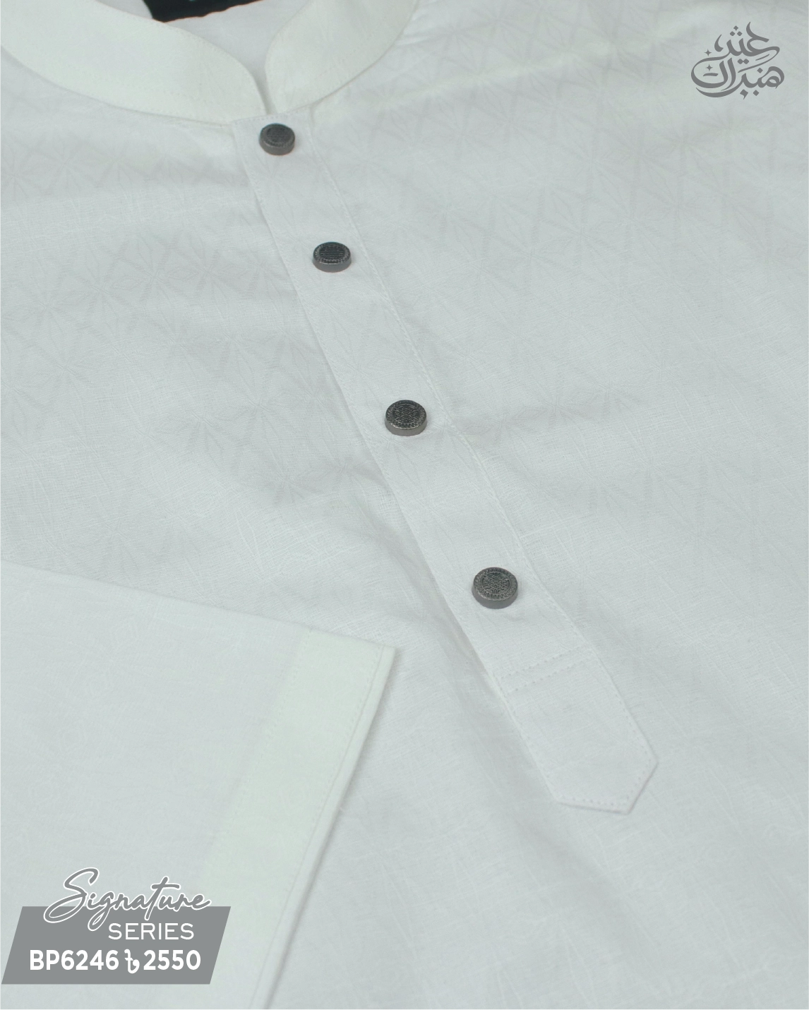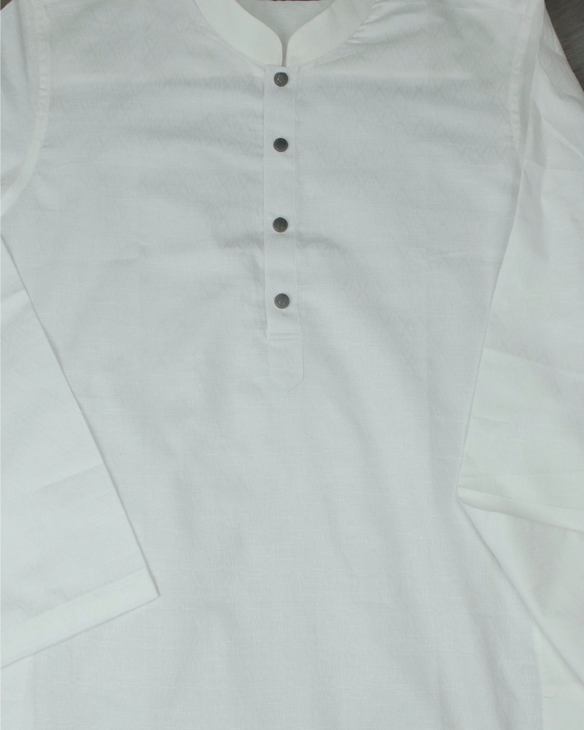 Crafted from ultra-soft premium cotton fabric, this high-segment white Panjabi embodies timeless elegance and refined simplicity. Designed for men who value sophistication, the fabric offers a smooth hand-feel, breathable comfort, and a naturally graceful drape.
